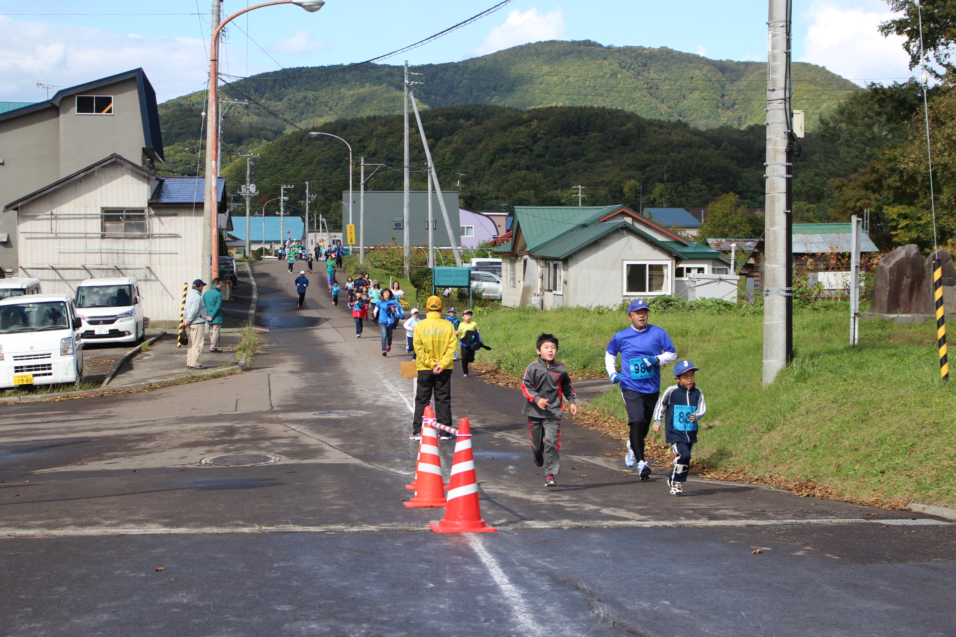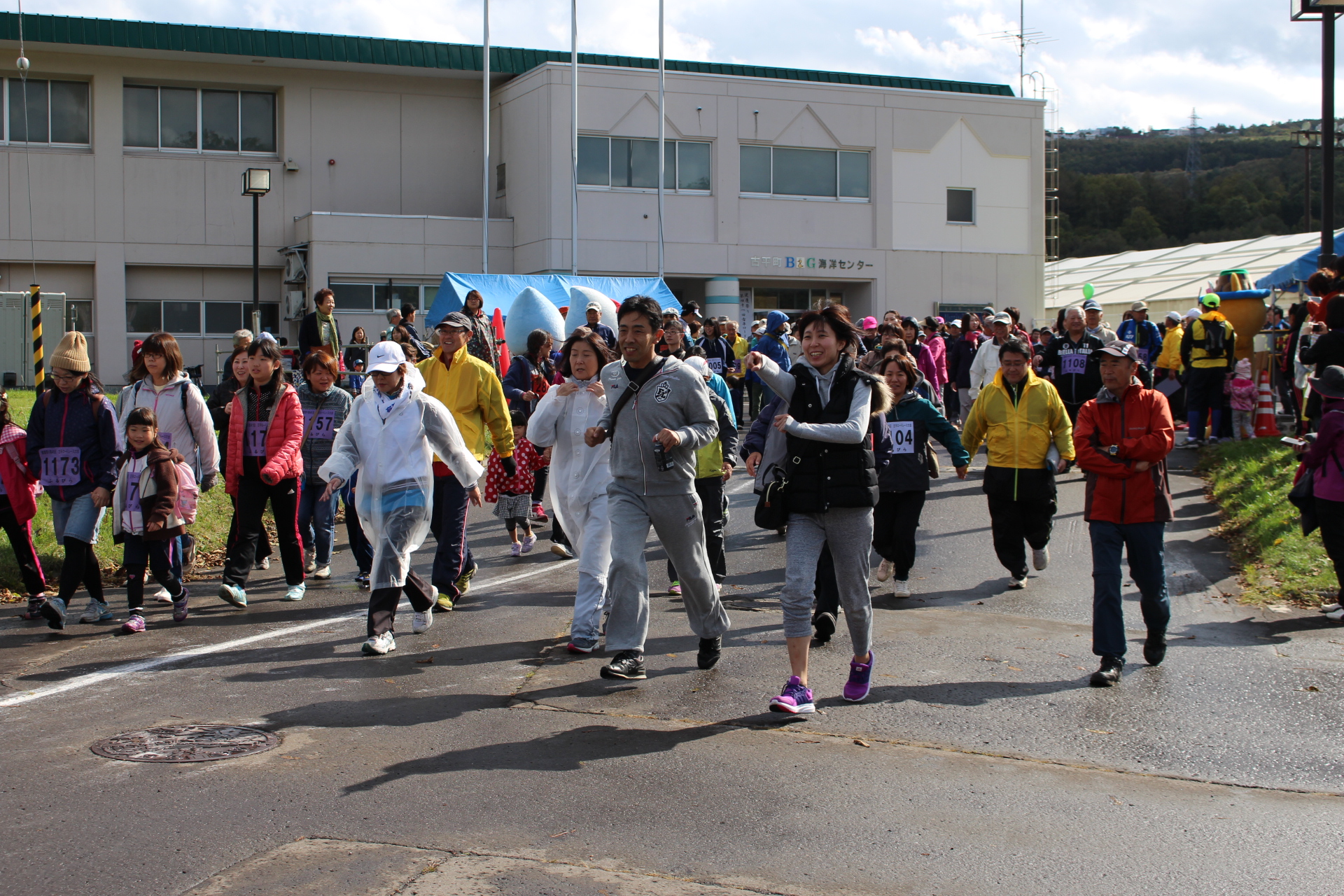 体育の日の10月10日、古平町B&G海洋センター前を発着点に第41回古平ロードレース大会(実行委主催)が開かれました。 実行委員長は「順位や記録にこだわらず、秋の良い日をそれぞれの走りで楽しんでください」とあいさつをしました。 雨がぱらつくあいにくの天気でしたが、市民ランナーや親子など町内外から約1200人が参加し、2~15㌔の走るコースの参加者は、赤や黄色に色づき始めた紅葉を楽しみながら道道998号を力走。2、4㌔の歩くコースの参加者は、秋の風景を眺めながら家族や友人と自分のペースで歩いていました。レース後は、主催者から恒例の豚汁も振る舞われ、出場者は空腹を満たしていました。 6㌔を走った古平中3年の男子生徒は「練習どおり走れたのでいいタイムが出たと思います」と話してくれました。また、15㌔を走り1位だった札幌市の男性は「思っていたよりいいタイムが出せたので良かった。前半は向かい風で辛かったが、後半追い風になり楽な気持ちで走れました」と話してくれました。