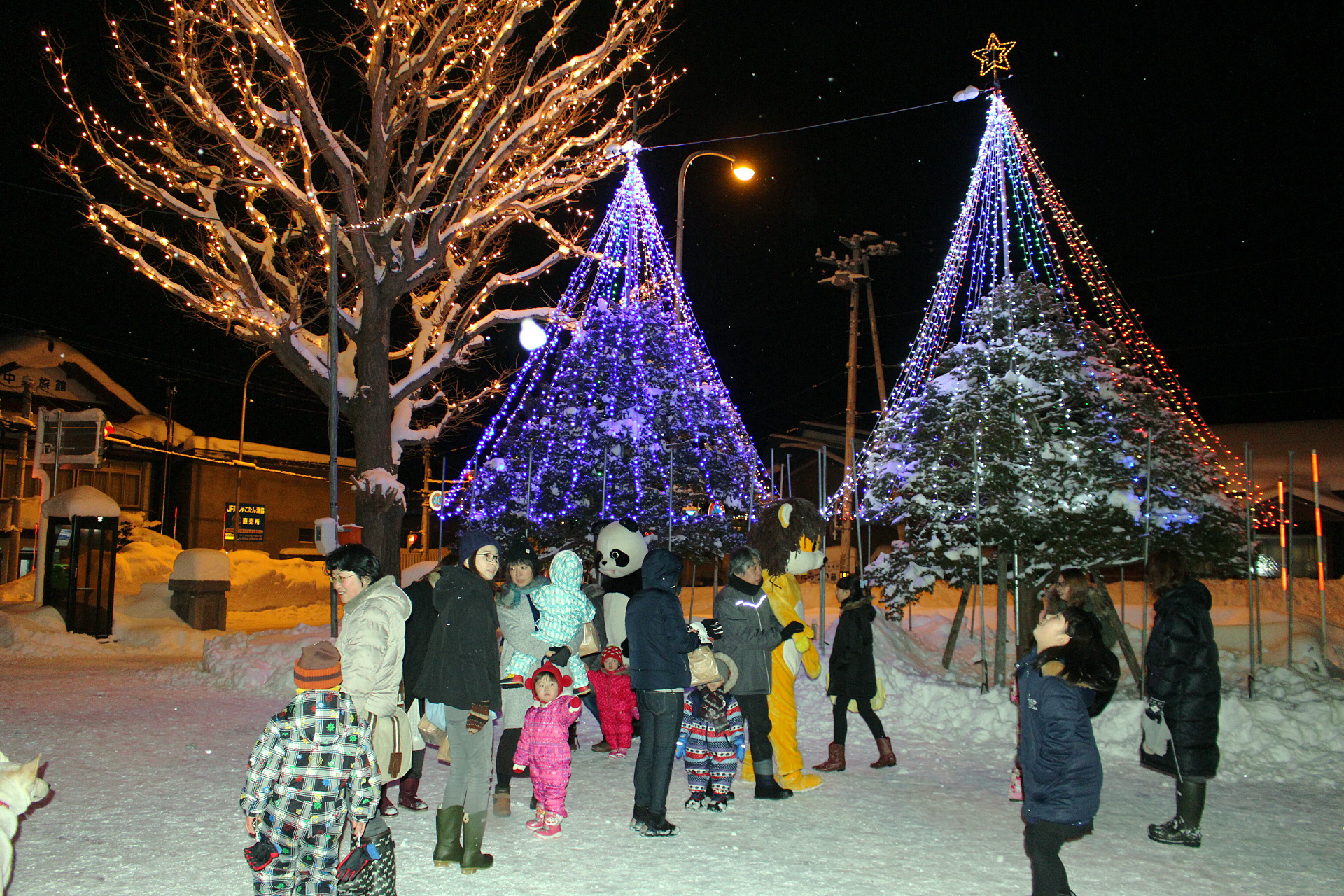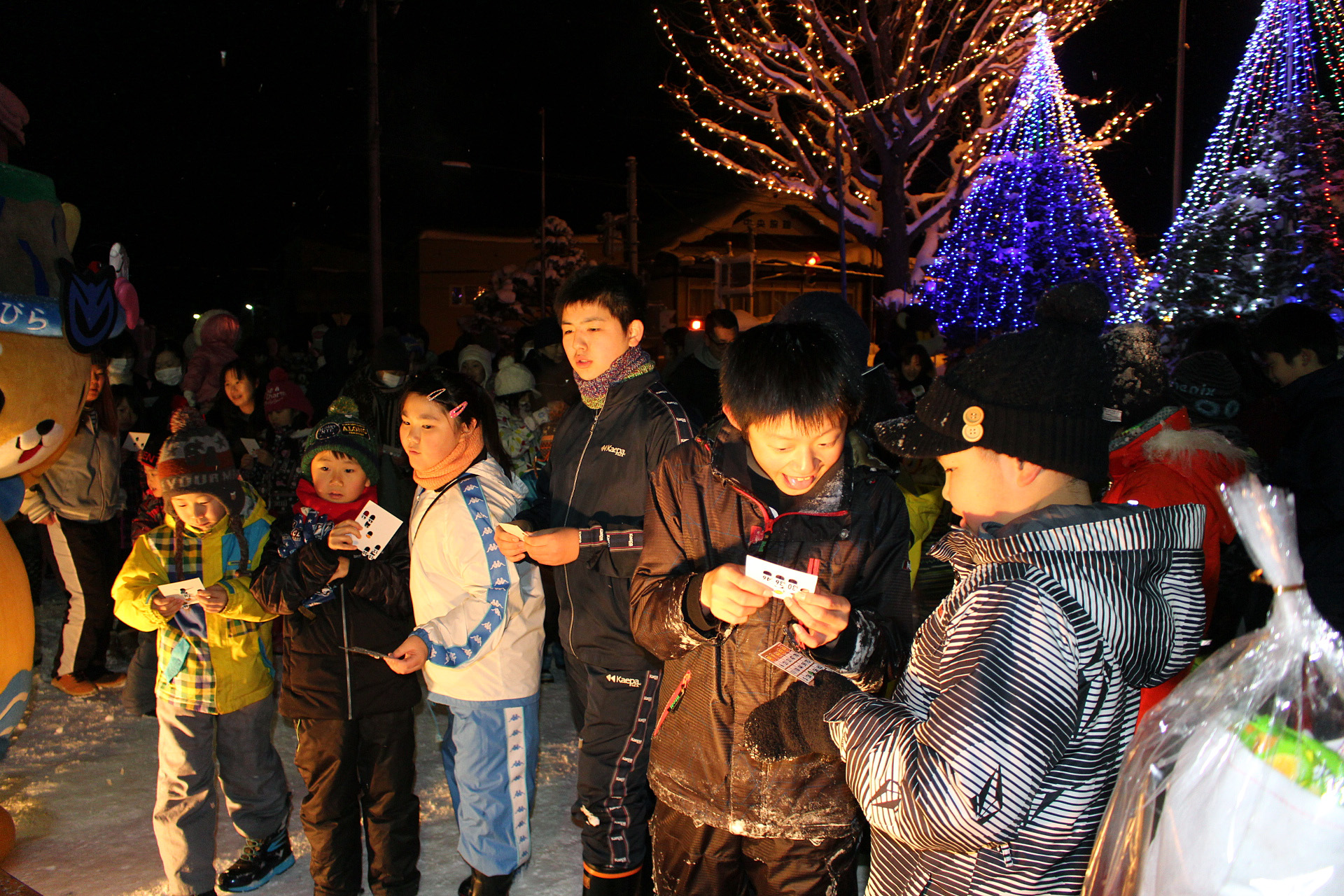 12月17日、町役場前のイチョウとオンコの木計3本に取り付けられたイルミネーションの点灯式が行われました。町職員有志でつくる実行委員会が企画し、昭和63年から毎年行われ、今年で29回目の開催となります。設置費用や電気代などは同委員会が自主制作したカレンダーの販売収入などで賄っています。 点灯式ではカウントダウンの合図で赤・青・白の電飾が光ると、200名の参加者から大歓声と拍手が沸き起こりました。お菓子の詰め合わせがもらえるビンゴゲームも行われ、子どもたちは一足早いクリスマスプレゼントに喜んでいました。 参加した女子生徒は「イルミネーションはきれいだし、ビンゴゲームも楽しかったです」と話してくれました。 イルミネーションは、来年1月7日まで、毎日午後4時30分から同9時まで点灯されます。