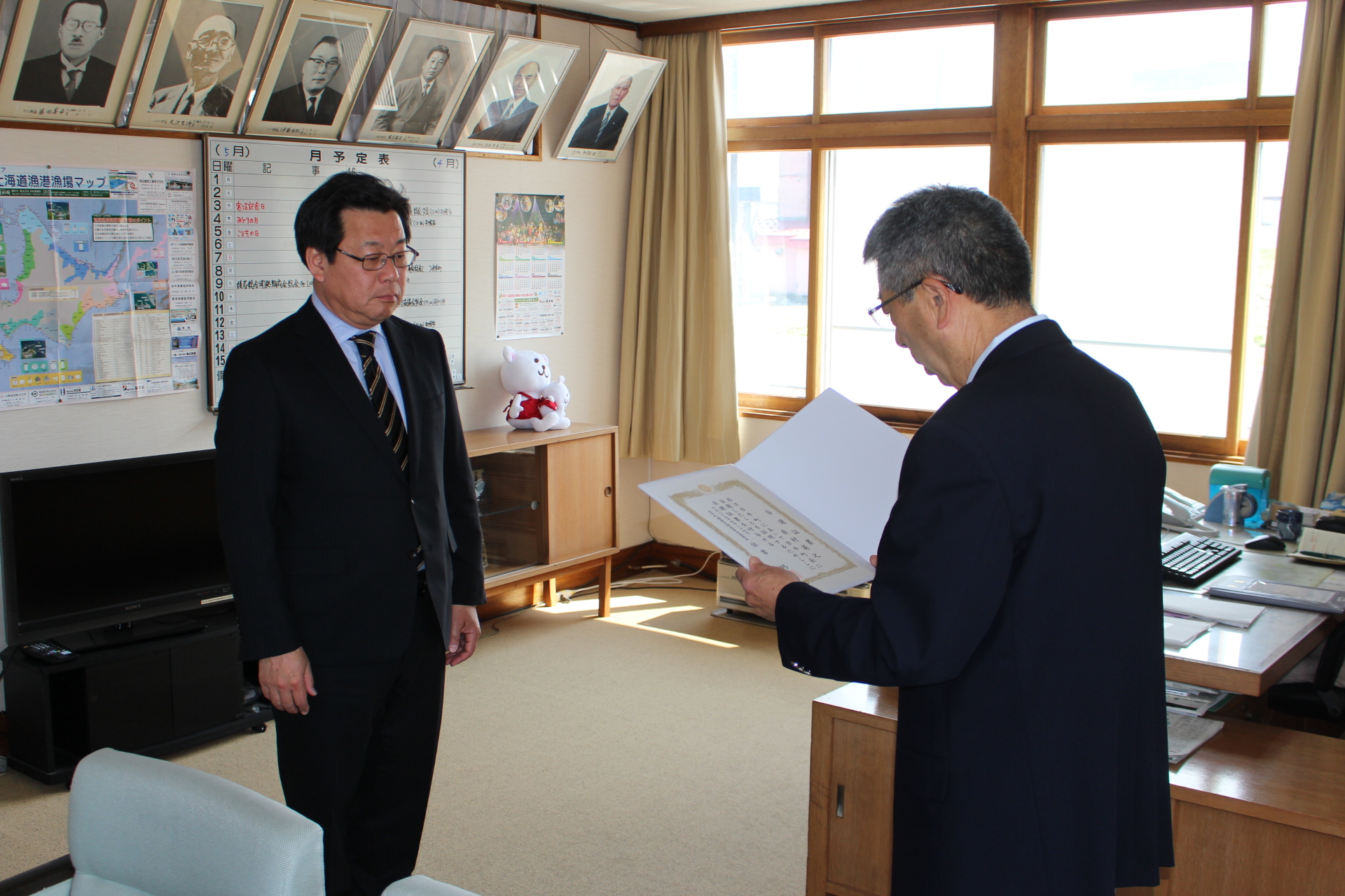 そして4月24日に古平町役場の町長室で選挙管理委員会委員長から貞村英之氏へ当選証書が授与されました。任期は平成29年5月20日から平成33年5月19日までの4年間です。